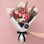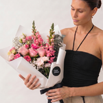 A soft-spoken arrangement in every shade of pink. Romantic roses, ruffled lisianthus and tall snapdragons gather with white chrysanthemums, baby’s breath and silvery eucalyptus. Hand-tied and wrapped in our signature white paper, finished with a black satin ribbon. Made for birthdays, new arrivals, and the kind of just because moments that deserve flowers.