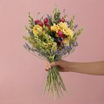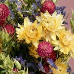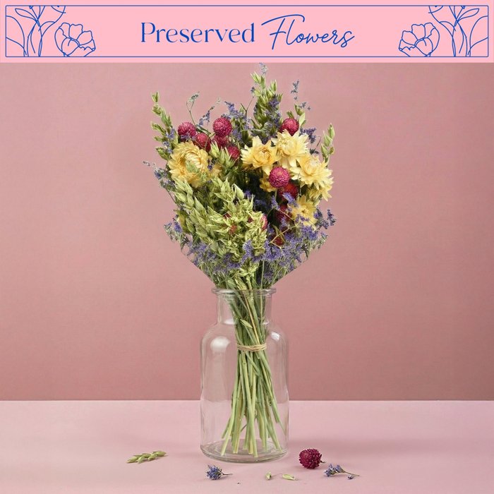 Radiating with meadow charm, this nature-inspired bunch blends natural green avena, limonium natural purple, gomphrena natural purple and white helichrysum for a soft, uplifting look that lasts beautifully with zero fuss.