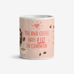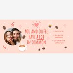 Featuring a circular photo area with red hand-lettered coffee pun text, coffee bean doodles, a latte cup, and bullet point phrases on a pale pink background.