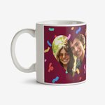 Featuring a heart shaped photo area on the left of the design, with colourful confetti scattered around, next to large pink textured typography on a deep magenta/red background.