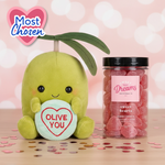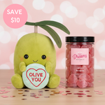 Say it with a pun (and some lollies) this Valentine’s. This cuddly little olive is here to spread the love, complete with a bag of heart-shaped goodies for an extra sweet touch. Cute, quirky, and guaranteed to get a smile.