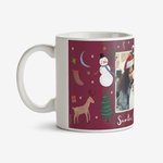 A cheerful Christmas design with a deep red background and illustrated festive details including Santa Claus, a snowman, reindeer, Christmas trees, stockings, holly, candy canes, presents, and stars. A large rectangular photo upload frame with a scalloped cream border and bow detail sits at the centre.