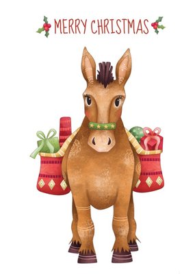 Illustration Of A Donkey Carrying Presents On A White Background Christmas Card