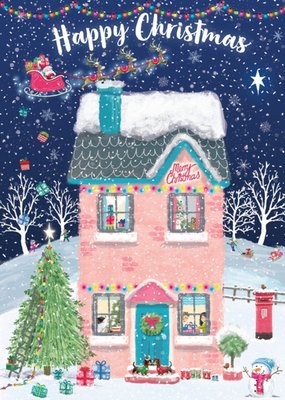 Festive Illustration Of A Cosy House With Santa And His Reindeers Flying Above Happy Christmas Card