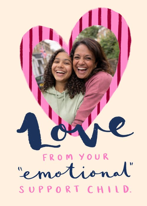Featuring a hand-drawn striped heart frame with an area for a personal photo, on a cream coloured background.