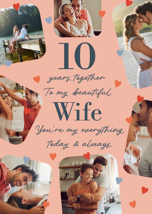 Playful greeting card celebrating 10 years together, featuring a large teal “10”, elegant script lines, and rounded photo frames decorated with red and blue hearts around the edges, set against a soft peach background.