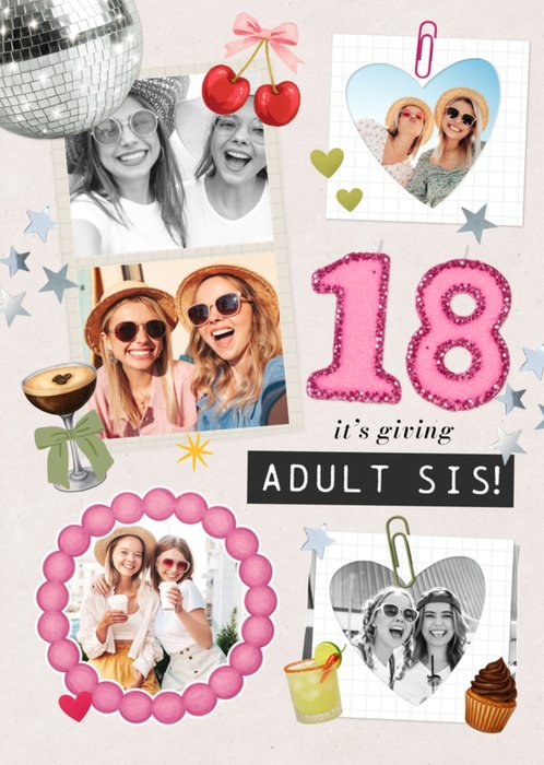 Playful collage-style design with five photo upload frames surrounded by stars, hearts, drinks, cherries, and a disco ball. Bold pink glitter “18” is shown with text in mixed fonts.