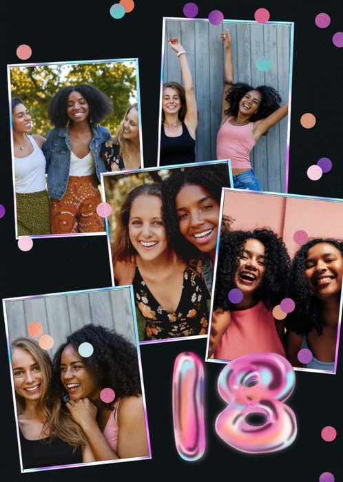 Featuring 5 layered photo frames, scattered confetti dots and a large 18 neon-style number at the bottom, all on a black background.
