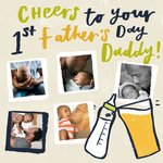 Front of card: 1st Father's Day Photo Upload Card Illustration of a baby bottle and a pint of beer clinking with five photo frames. Text reads: "Cheers to your 1st Father's Day Daddy!".