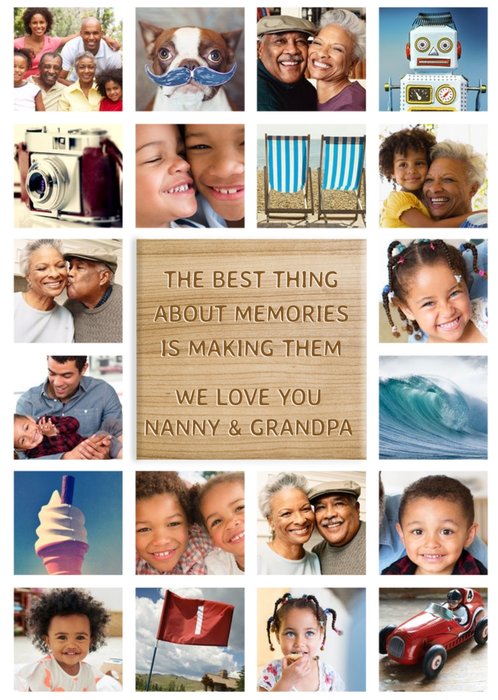 20 photo upload frame card, with central text that reads "The best thing about memories is making them. We love you Nanny & Grandpa." Order this card as a large or giant card and frame it to show off your time spent together.