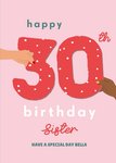 'Happy 30th birthday sister' -fixed text, 'Have a special day Bella' -this can be personalised!