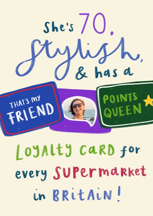 "She’s 70, stylish, & has a loyalty card for every supermarket in Britain! That’s my friend, points queen." "70" is editable.