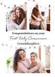 Front of card: White background with decorations over three photo uploads with text in the centre. Text reads: Congratulations on your First Holy Communion Granddaughter. Editable text reads:"Granddaughter".
