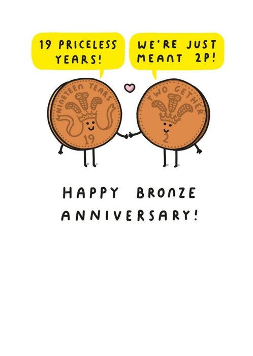Front of card: Meant To Be! 19th Anniversary Funny Pun Card Cartoon Illustration of a pair of two pence pieces. Text reads: "19 priceless years! We're just meant 2p!" and "Happy bronze anniversary!"