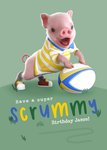 Front of card featres a Moonpig dressed in a rugy shirt and standing on a rugby ball.