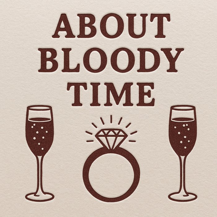 Featuring a cream greeting card with a simple dark red illustration of a diamond ring between two champagne glasses in the centre, creating a bold, celebratory design.