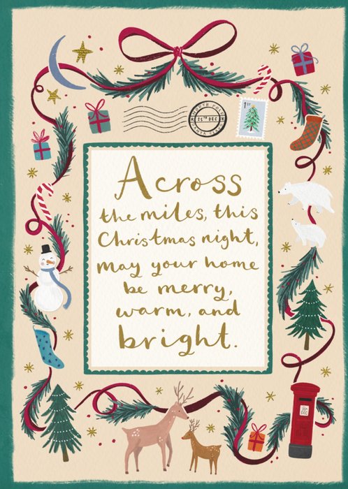 A festive design framed with illustrated holly, pine branches, presents, candy canes, stockings, reindeer, polar bears, and a red post box. A small postage stamp and “North Pole” postmark appear at the top to match the “across the miles” theme. The background is cream with a green border and a central cream panel bordered in green.