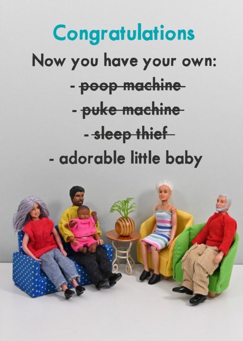 "Congratulations Now you have your own: - poop machine - puke machine - sleep thief - adorable little baby".