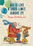 Front of card: Featuring a funny illustration of an old man driving a mobility scooter with a dog in the front basket. Text reads: "Age is like a speed limit. Ignore it! Happy Birthday Joe". 'Happy Birthday Joe' can be personalised!