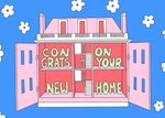 Front of card: Illustration of a dolls house opened up, on a blue background with illustrated white flowers scattered about Text reads: "Congrats On Your New Home"