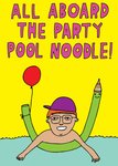 Front of card: All Aboard The Party Pool Noodle Birthday Card Funny illustration of a person on a pool noodle. Text reads: "All aboard the party pool noodle!".