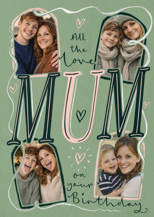 Featuring a central large hand-lettered Mum typography surrounded by four photo frames, hand-drawn hearts and doodle details on a green background.