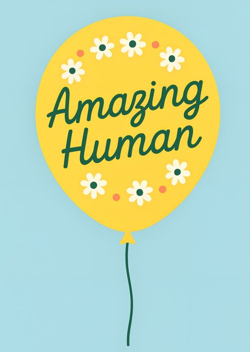 Featuring a large yellow balloon decorated with white flowers, with script text in the centre, on a light blue coloured background.