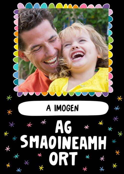 Illustration of text and name in a bubble with stars. And photo upload frame on black background.