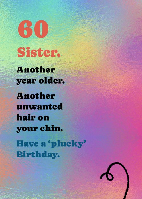 "60 Sister. Another year older. Another unwanted hair on your chin. Have a 'plucky' Birthday."