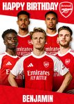 This greeting card features five Arsenal football players in red and white kits standing together, with bold text at the top and the Arsenal logo on a red patterned background.