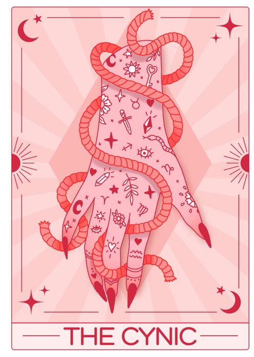 Featuring a tarot card illustration with a tattooed hand with moons and stars on a pink sunburst background.