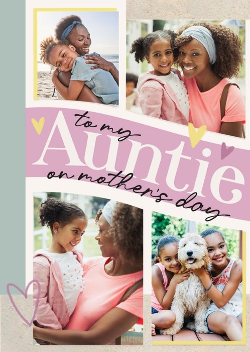 Front of card: Features 4 photo upload areas, surrounded by hearts. The card has a pastel and neutral colour scheme. Text reads: "To my Auntie on Mother's Day."