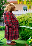 Front of card: Featuring a funny photograph of a bear standing in the garden wearing a dressing gown and slippers while holding a garden hose and watering the plants.