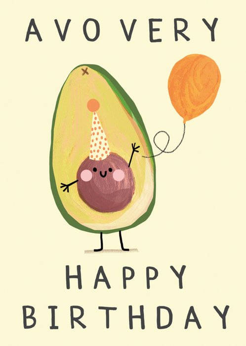 Features a cute illustration of half an avocado with a smiling face in the centre of the card. It's wearing a party hat and holding an orange balloon. At the top and bottom is black text.
