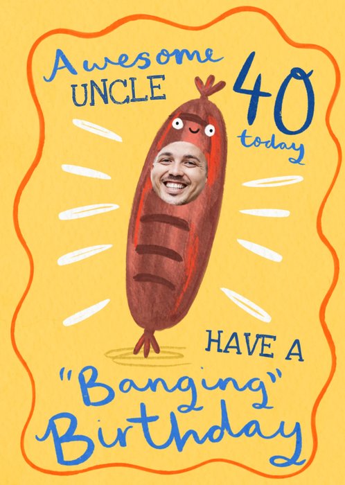 Featuring an illustrated sausage character containing a photo upload area for the recipient's face, surrounded by hand-drawn lettering on a yellow coloured background.
