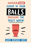 Front of Card: Bold typography and illustration of a toilet on a cream background Text reads: "Another year closer to your balls touching the toilet water! Happy birthday mate!".