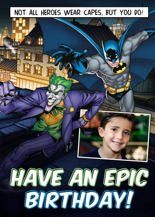 Front of card: Batman And Joker Photo Upload Birthday Card Illustration of Batman chasing Joker. Text reads: "Not all heroes wear capes, but you do! Have an epic birthday!".