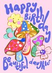 Front of card: Featuring a bright & bold hand-painted psychedelic illustration of mushrooms & flowers surrounded by bold blue typography, all on a pink background.