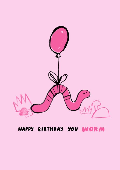 This card features a playful pink worm tied to a pink balloon, with the phrase “Happy Birthday You Worm” in a whimsical font against a pink background, adding a humorous and lighthearted touch to the birthday message.