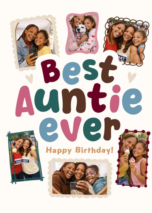 Featuring multicoloured hand-lettered text with small cream hearts on an off-white greeting card, surrounded by six rounded photo upload areas at the top and bottom for an auntie's birthday.