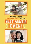 Front of card: This greeting card design features a bright yellow background with bold text that reads, “Wishing a very happy Birthday to the best auntie ever!” The two rectangular photo upload areas are framed in orange and located at the top and bottom of the card.