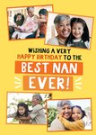 This bright and cheerful birthday card design features a yellow background with four rectangular photo upload areas placed across the card: two at the top, slightly tilted, and two at the bottom, also tilted. The central message in bold white and orange text reads “Wishing a very happy birthday to the best nan ever!”, with decorative lines surrounding the word “EVER” for emphasis.