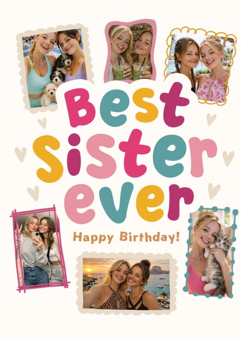 Featuring large, multicoloured hand-lettered text with small cream hearts on an off-white greeting card, surrounded by six rounded photo upload areas at the top and bottom for a sister’s birthday.