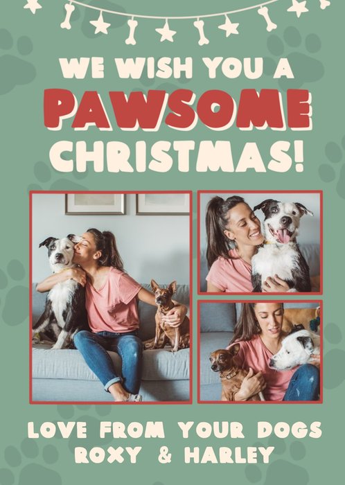 "We Wish You A Pawsome Christmas! Love From Your Dogs Roxy & Harley". 'Love From Your Dogs Roxy & Harley' can be customised.