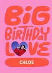 Front of card: Big bold red text sits on a bright pink background, the O of love is a heart-shaped photo upload frame. Text reads: "BIG Birthday Love Chloe."