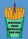 Featuring a cartoon illustration of a carton of fries, with bold black text & a lit birthday candle, all on a blue coloured background.