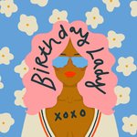 A bold illustrated design featuring a confident woman with pink hair and blue sunglasses, wearing a white top with orange trim. The background is patterned with cream flowers on a blue backdrop.