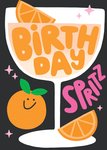 Front of card: Featuring bold colourful typography on a black background with an illustration of a cocktail with 2 orange slices and an orange with a smiley face on it.