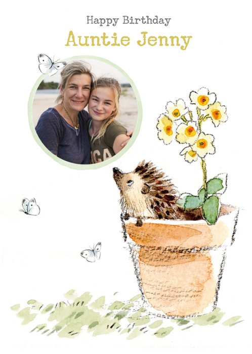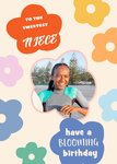 Front of card: Floral illustrated shapes, photo upload on an orange background. Text reads: "To the sweetest Niece have a blooming birthday". 'Niece' can be personalised!