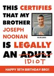 "This certifies that my brother Joseph Noonan is legally an (adult) idiot", "10.08.2003" and "happy 18th birthday bro!". 'Joseph Noonan', '10.08.2003' and 'happy 18th birthday bro!' can be personalised!